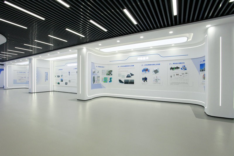 頂和地面造型統一,白色吊頂和灰色橡膠地面,黑色方鋼吊頂和灰色橡膠地面相互呼應,統一中富有變化,變化中又蘊含統一,使整個展廳科技意境深遠悠長。