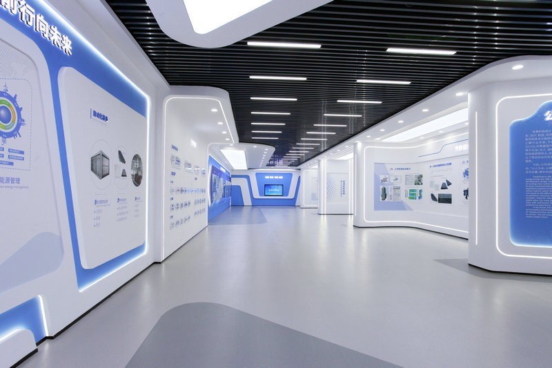 頂和地面造型統一,白色吊頂和灰色橡膠地面,黑色方鋼吊頂和灰色橡膠地面相互呼應,統一中富有變化,變化中又蘊含統一,使整個展廳科技意境深遠悠長。